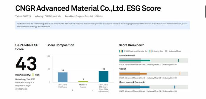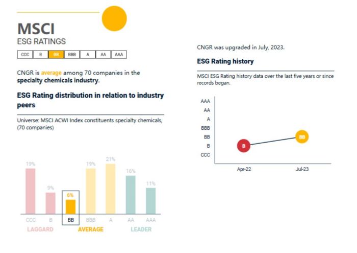 在2023年的標(biāo)普CSA評分中,中偉股份得分38分,與去年相比提升了10分。值得一提的是,這一分?jǐn)?shù)已達(dá)到入選“標(biāo)普中國可持續(xù)發(fā)展年鑒”門檻,代表中國可持續(xù)發(fā)展標(biāo)桿示范企業(yè)水平。與此同時(shí),中偉股份在明晟的ESG評級也由2022年的B等級提升到了2023年的BB等級,這一評級結(jié)果與相關(guān)上下游企業(yè)相比,已處于中間水平。在富時(shí)羅素的ESG評分中,中偉股份也取得了2.6分的好成績,這一分?jǐn)?shù)已顯著高于行業(yè)平均水平。