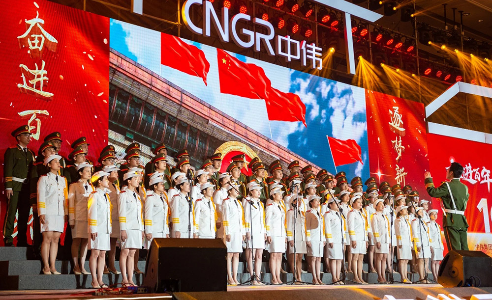 在主持人的宣布下,合唱比賽正式開始。來自各事業(yè)部、各產(chǎn)業(yè)基地的8支隊伍相繼登臺,他們或穿著光彩照人、顏色各異的演出服,或穿著整齊莊嚴、意義非凡的紅軍服,伴隨著音樂老師的指揮,用嘹亮、深情的歌聲,回顧和紀念中國共產(chǎn)黨的百年奮斗史。